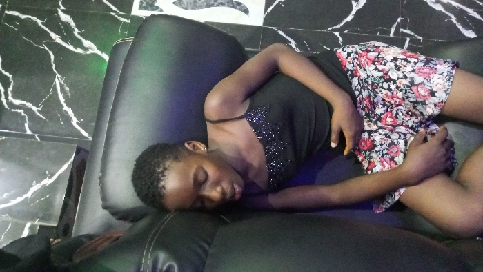 A young woman lies on a black leather couch. She wears a black spaghetti strap top with glitter detailing and a floral-patterned skirt. Her eyes are closed as she rests her head on the couch's arm. One hand is near her face, while the other is resting on her thighs. The couch is situated on a black and white marble-patterned floor. A dark object, possibly a bag, rests to the left of the couch.