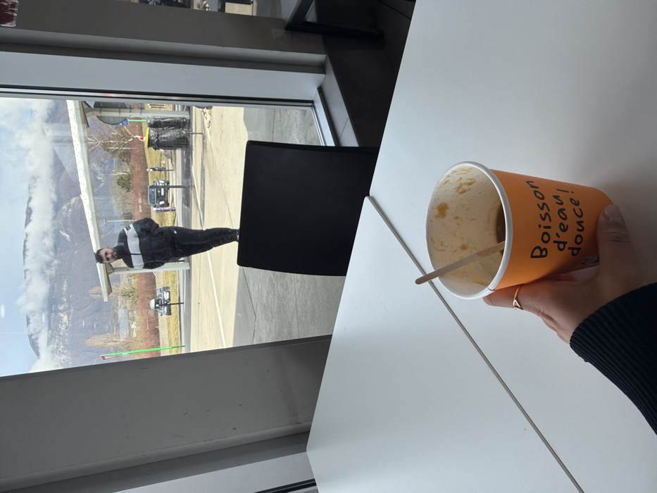 The scene depicts an interior view looking out through a large window towards an outdoor commercial area, likely in Saint-Jeoire-Prieuré, France, with mountains in the background. In the foreground, from an indoor perspective, a person's right hand is holding an orange disposable paper cup. The cup is partially consumed, containing a dark liquid with a wooden stirrer, and bears the French inscription "Boisson d'eau douce!" (Sweet water drink!). A gold-colored ring is visible on the person's ring finger, and the sleeve of a dark garment covers the wrist. The hand and cup are positioned on a white tabletop. To the left, a larger section of the white tabletop is visible, separated by a seam. A black chair back is partially visible to the right, obstructing a segment of the window view. Through the window, a male individual is standing outdoors, facing the observer. He has a dark beard and short dark hair. He is wearing a black, white, and grey horizontally striped puffer jacket and dark trousers. His hands are in his pockets. He stands on a paved surface, which appears to be part of a parking lot or service station forecourt. In the mid-distance behind him, several vehicles are parked, including a black SUV on the right and another dark vehicle with a roof attachment on the left. A light-colored covered structure, possibly a car wash or fuel station canopy, is also visible. To the right of the standing male, two black cylindrical waste bins are present. The background features large mountains under a partly cloudy sky. Some clouds are low, partially obscuring the mountain peaks, which show some scattered snow patches. The lower slopes of the mountains are green with sparse trees. The overall weather appears clear with good visibility.
