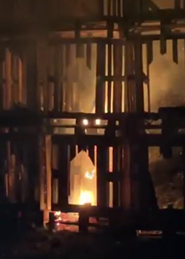 structure made of wooden pallets engulfed in flames. The fire is concentrated at the base of the structure, with flames rising high inside the pallet enclosure. Smoke is visible, and there is ambient light suggesting it is nighttime. The wood is visibly burning, and the structure appears to be collapsing in places. There are some voices audible in the background.