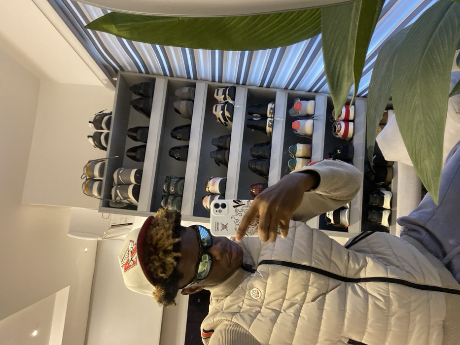 In Igboefon, Nigeria, a male individual is captured in a mirror selfie, extending his right arm to hold a white iPhone with a graphic skull and flames case. He wears a white baseball cap with a red emblem, revealing light brown curly hair underneath, and dark mirrored sunglasses. His attire includes a light beige puffer vest with black trim and a small circular red-on-white emblem on the left chest, worn over a light grey long-sleeved shirt. Grey sweatpants are visible in the lower portion of the image. Behind the subject's reflection, a grey multi-tiered shoe rack is filled with numerous pairs of shoes, including sneakers and dress shoes of various colors. The background also reveals a white wall, a white ceiling with a recessed light fixture, and a white air conditioning unit or vent. To the right, a window with horizontal blinds is partially visible, while a large green-leaved plant occupies the right foreground.