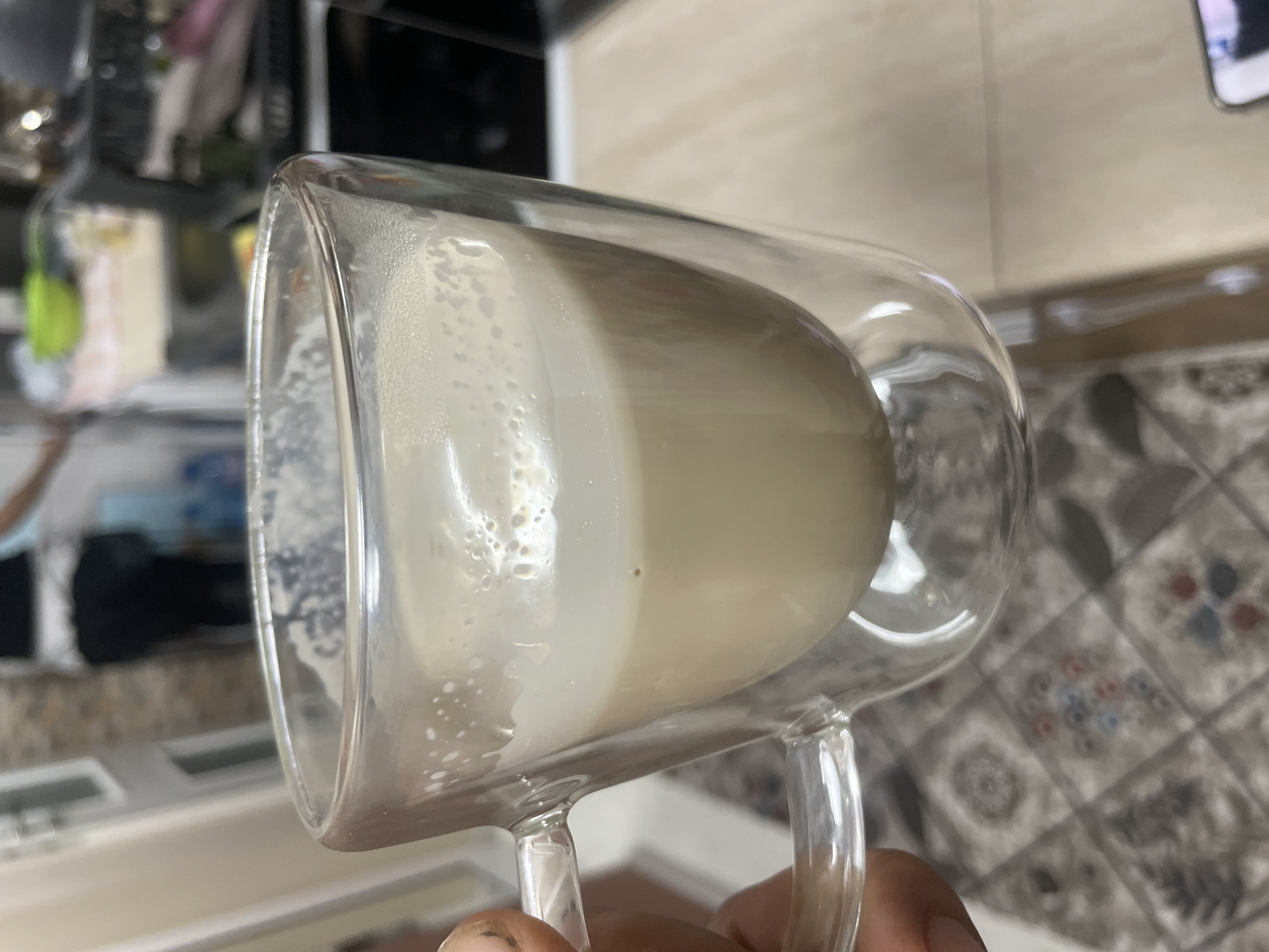 A close-up shot features a clear glass mug filled with a light beige liquid, likely milk or a latte, with a layer of foam on top. The mug is a double-walled design, which creates a visual effect of the liquid floating within the glass. The mug is held by a hand. The background is blurred and shows a kitchen area with light-colored countertops, a stovetop, and other kitchen items. The overall setting appears to be indoors, likely in a home. The exact location in Sofia, Bulgaria, cannot be determined from this image alone.