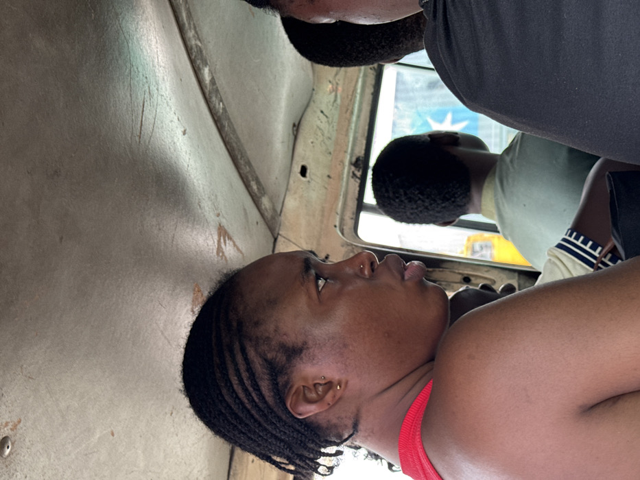 Inside a public transport vehicle in Ikate, Nigeria, a foreground individual, appearing female, with dark skin and cornrow braids, is seated on the left