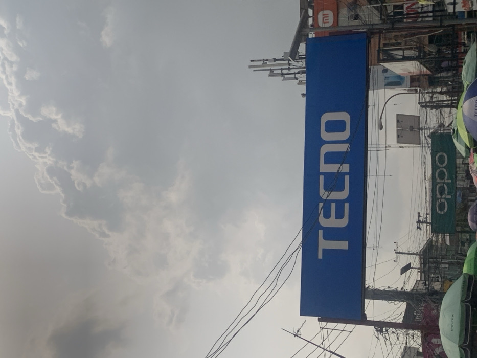 The image depicts an urban street scene in Ikeja, Nigeria, under a predominantly overcast sky with thick, light gray clouds. A large, rectangular blue billboard bearing the brand name "TECNO" in white capital letters dominates the mid-ground. Below and to the left of this main sign, a green horizontal sign displays "oppo" in white lettering. To the right of the TECNO billboard, an orange sign with the "Mi" logo is partially visible on a building facade. Overhead, a complex network of black electrical and communication wires spans across the frame, connecting to several utility poles. A streetlight fixture is visible in the upper mid-ground. On the rooftops of structures to the right, multiple cellular communication towers and antennas are apparent, along with a solar panel. At the bottom of the image, the tops of numerous market stall umbrellas or canopies, colored green and light blue, indicate commercial activity at street level. No specific individuals or their actions are clearly discernible within the frame.