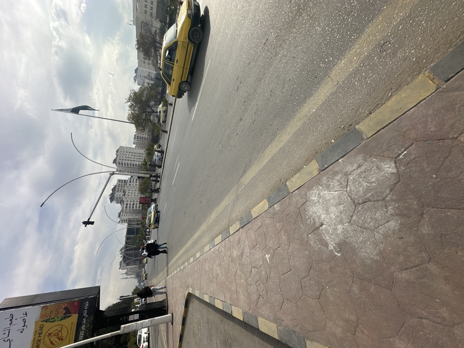 The image depicts a daytime urban street scene in a city of Unknown, Unknown, under an overcast sky with scattered clouds. The perspective is from a low angle on the sidewalk, looking down a multi-lane asphalt road. In the foreground, a reddish-brown patterned concrete sidewalk occupies the left side of the frame, showing patches of white residue. This sidewalk is bordered by a curb painted in alternating yellow and dark grey/black segments, separating it from the roadway. The roadway, a grey asphalt surface, features a double yellow line indicating lane separation. Traffic is moving away from the viewer on the right lanes and towards the viewer on the left lanes further down. A prominent yellow sedan taxi, consistent with an older model Kia Pride, is positioned on the right side of the road, driving away, exhibiting visible dirt on its front bumper. Several other yellow taxis are observed further down the street. Other vehicles, including a white sedan and a motorcyclist, are also visible. On the left side of the road, a large vertical billboard displays Arabic text and "HORSE HEAD" tea branding, with additional Arabic script mentioning "tea since 1920." Two pedestrians are walking away from the viewer on the left sidewalk. In the middle of the road, two individuals are walking across the lanes from left to right; one appears to be wearing a head covering. Street furniture includes multiple distinctive street light poles with long, arching arms extending over the road, and a traffic light fixture. On the right side of the road, a tall flagpole flies a vertically striped flag, green on the left (hoist side) and white on the right (fly side). In the background, a dense urban landscape of multi-story buildings is present on both sides of the street. These structures appear to be modern, some with distinctive rooftop designs, including a large building in the mid-ground that features a unique, possibly under-construction or architecturally distinct, facade. Sparse trees and shrubs are visible along the road.