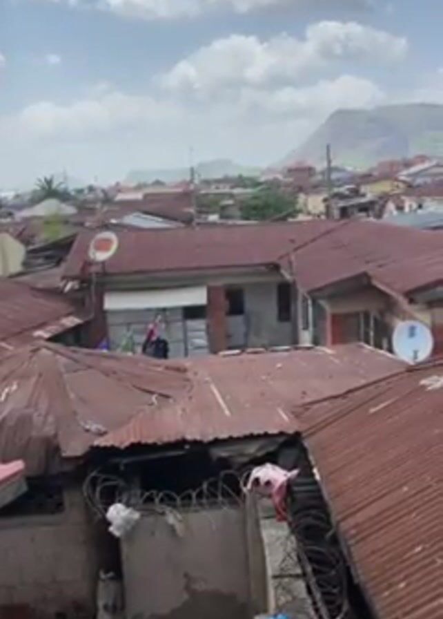 n elevated, slightly shaky view of a dense urban landscape. Many buildings with corrugated metal roofs are visible, most of which are rusty in color. The buildings appear to be closely packed together. In the background, a prominent mountain is visible against a blue sky with scattered clouds. On one of the rooftops, clothing is hanging to dry, and another roof section shows barbed wire along the top of a wall. A few satellite dishes are visible on the roofs as well. The overall impression is of a densely populated urban area, possibly in a developing country.