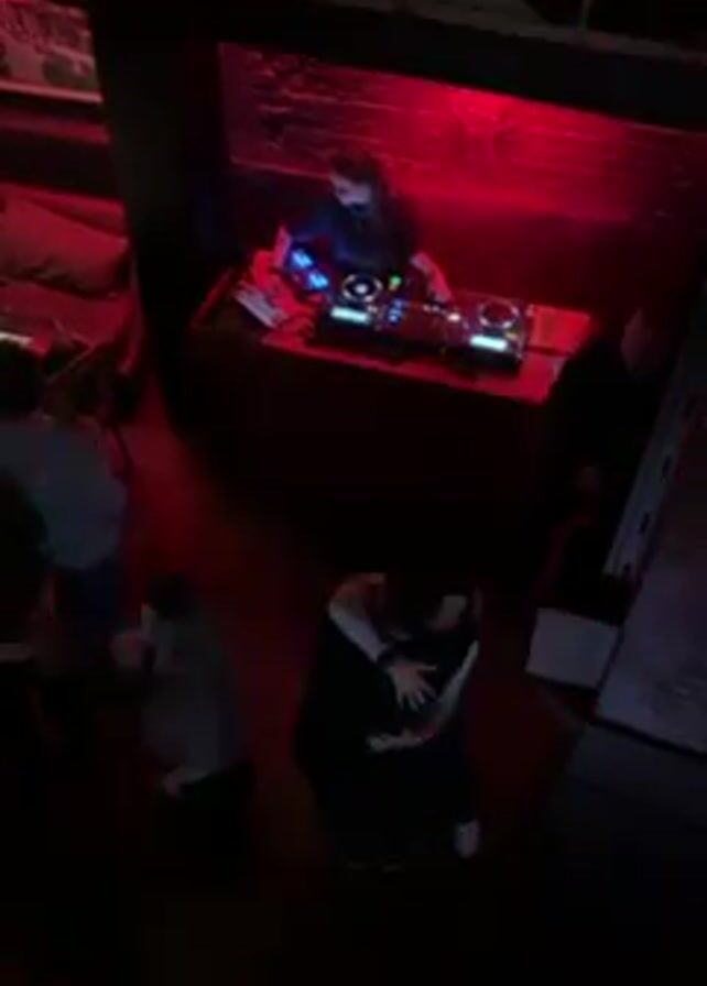 A top-down shot shows a DJ mixing music at a nightclub. A DJ stand with turntables and a mixer is bathed in red light. The DJ wears a black top. Several people are dancing in front of the DJ. The room is dark, with red lighting, and appears to be crowded. A man stands near the DJ stand observing.