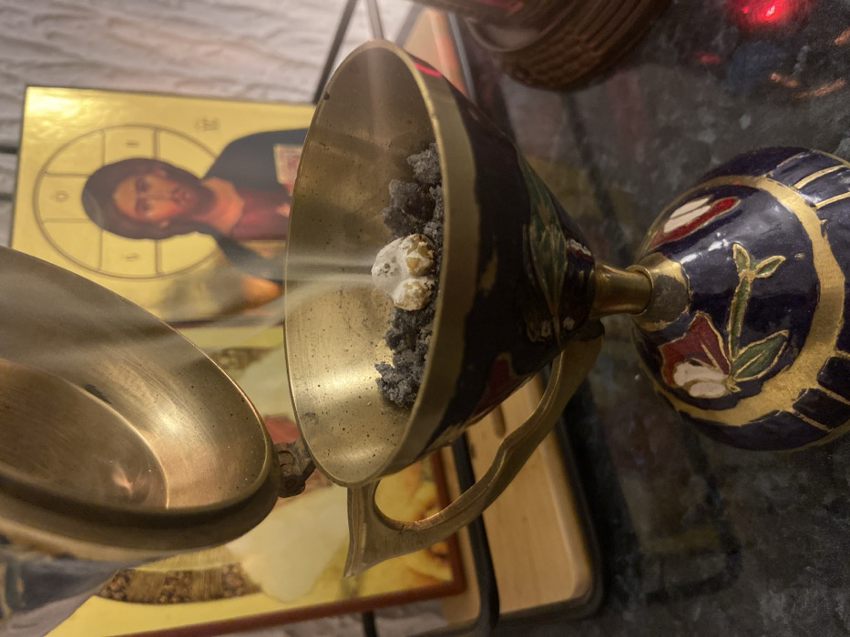 A censer sits prominently, filled with dark ash and a piece of burning frankincense emanating smoke