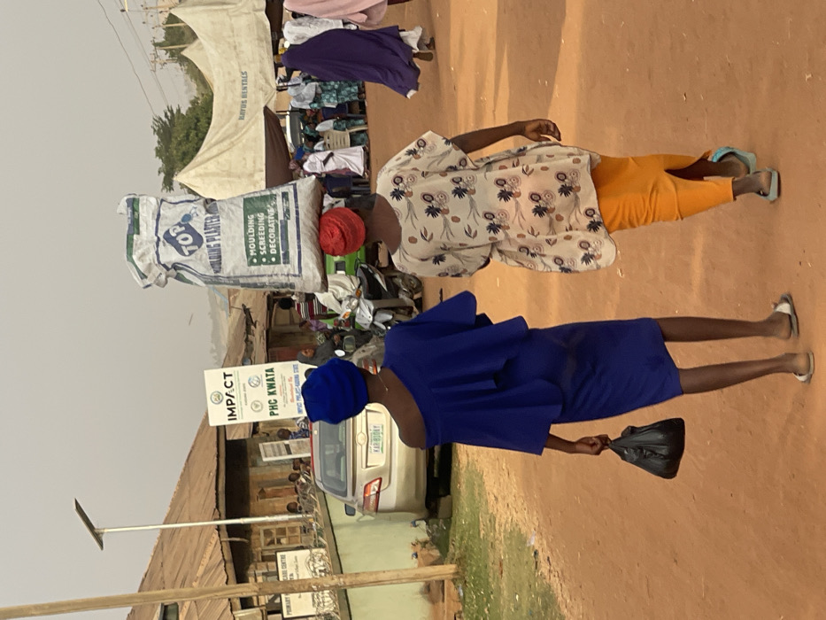 Two women stand on a dusty ground next to a building labeled "IMPACT PHC KWATA