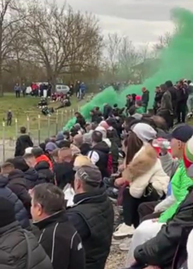 crowd of people gathered outdoors, with a large cloud of green smoke in the background. Most of the people are seated, and they are wearing a variety of casual clothing. Some people are standing near the source of the smoke. The background includes trees and a hill. The sky is overcast.