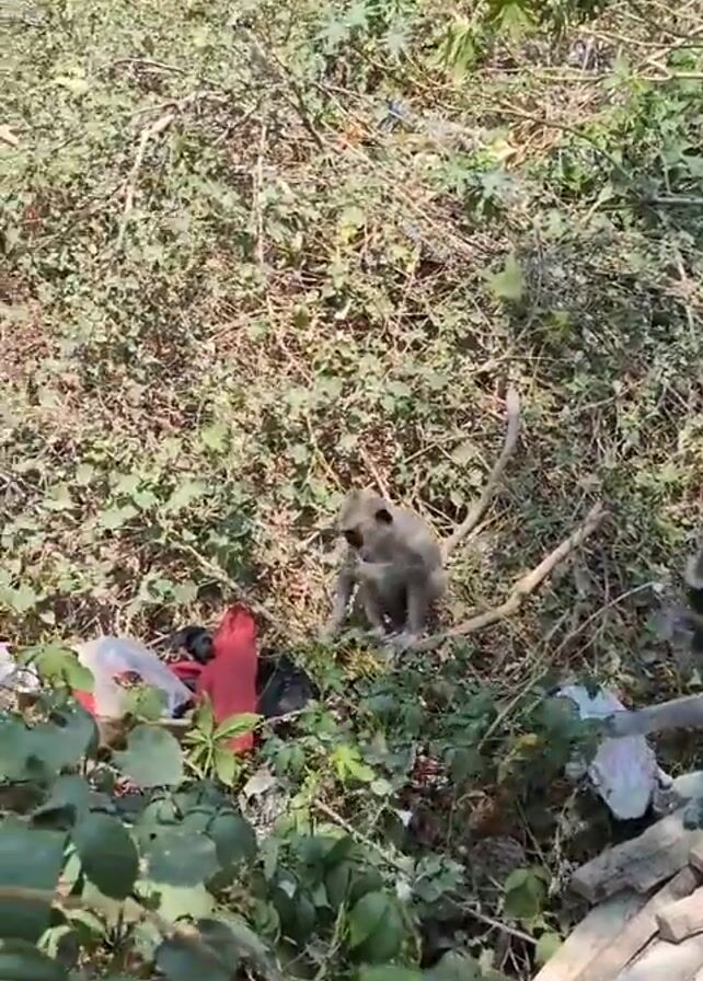 two Gray Langur monkeys in a bush area. One is smaller, possibly a baby. The larger monkey sits on a white surface, then moves to the bush, then climbs higher into the trees. The area is filled with branches, leaves, and some scattered trash. The sky is visible above the trees.