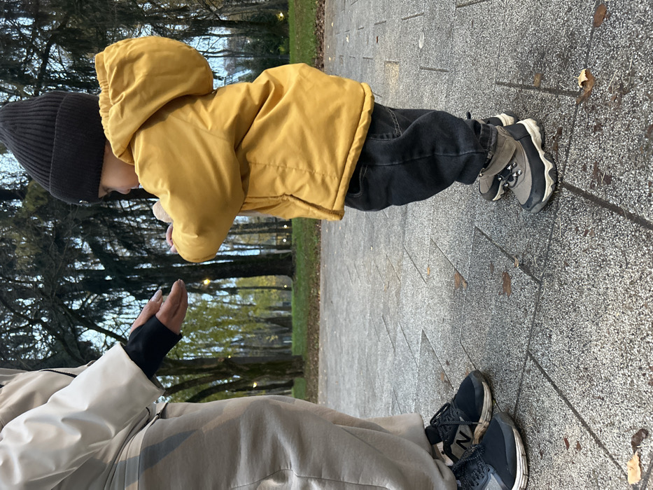 The image depicts a close-up, ground-level perspective of an interaction between an adult and a young child on a paved pathway within a park or pedestrian area in Kolomna, Russia. The environment suggests late autumn or early winter, with scattered dry leaves on the ground and trees in the background exhibiting sparse foliage and bare branches. Distant streetlights are illuminated, indicating late afternoon or early evening. An adult, partially visible on the left, wears light grey athletic pants and a matching light grey jacket with black wrist cuffs. Black and grey New Balance athletic shoes are visible on the adult's feet. The adult's right hand is extended towards the child, palm open and facing upwards, positioned approximately at the child's chest height. Light-colored manicured fingernails are visible. A young child stands on the right, facing the adult. The child wears a ribbed black beanie, a mustard yellow hooded jacket, dark grey jeans, and grey and black hiking-style shoes with prominent white soles. The child holds a small, light-colored, amorphous object, possibly a toy or snack, with both hands in front of its chest. The ground is covered with grey rectangular paving stones arranged in a distinct zigzag pattern. Several brown, dry leaves are scattered across the pavement surface. In the background, beyond a strip of green grass, are numerous deciduous trees.
