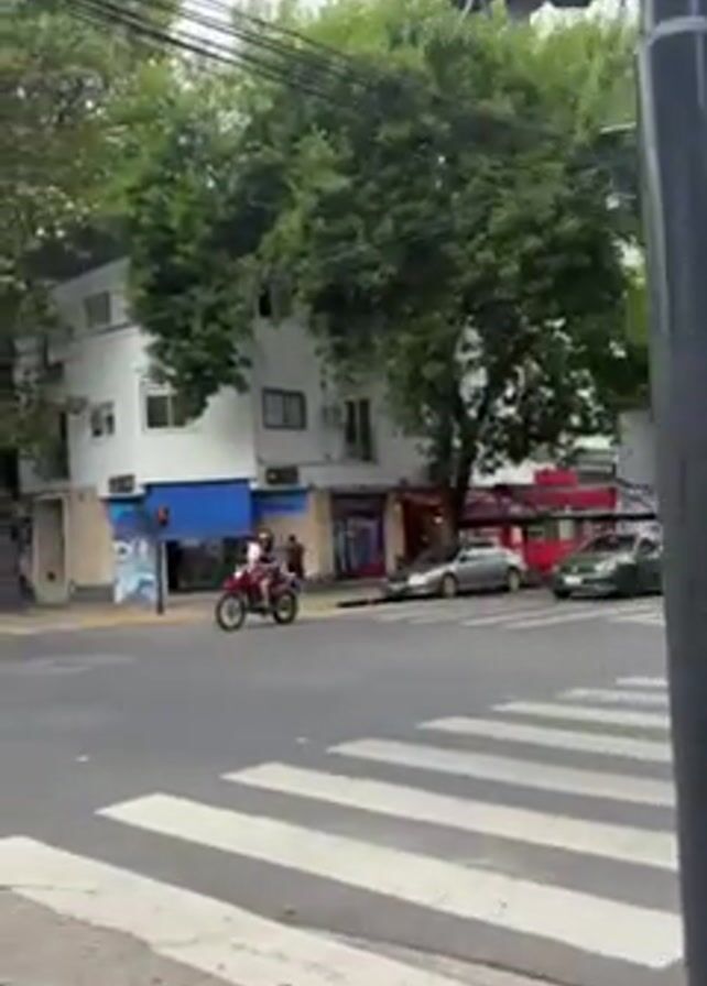street corner in a city, likely during the daytime. A red dirt bike is driven across a crosswalk. Several other vehicles are visible, including cars and a van. Pedestrians are walking on the sidewalks. Buildings and trees line the street, with a traffic light pole in the foreground. The sky appears overcast.
