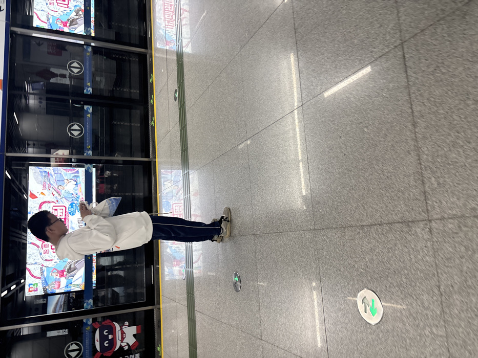 A person with short black hair, wearing glasses, a white sweater, and blue pants stands in a subway station