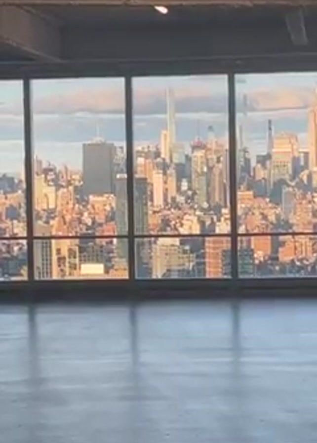 view of the New York City skyline through a large window. The room the camera is in appears to be empty and under construction.