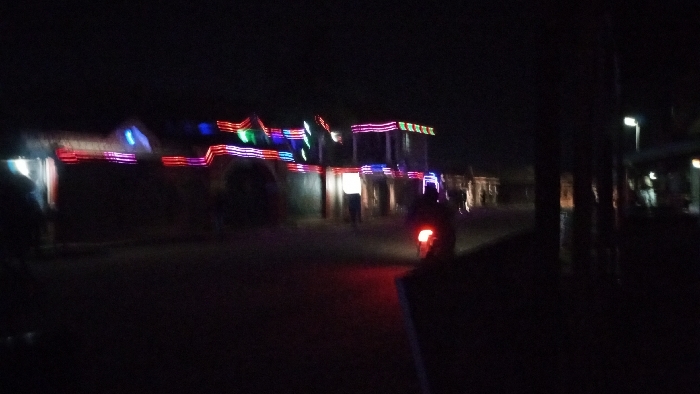 A night scene displays blurry, long-exposure lights indicating movement. A motorcycle with a lit tail light travels on a dark road. Buildings decorated with colorful, streaked lights are visible in the background. A street lamp illuminates the right side of the scene. The overall impression is of a blurred, night-time street view with moving vehicles and illuminated structures.