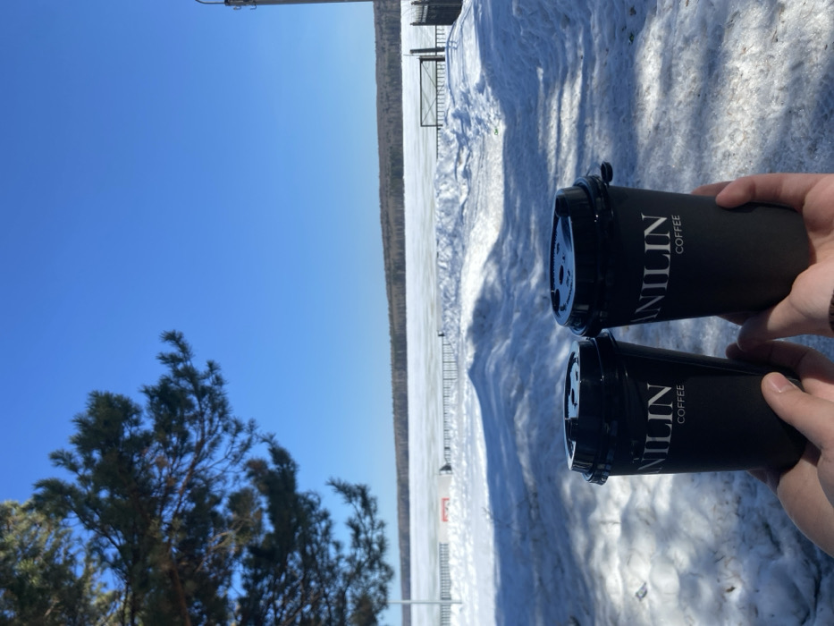 - "Two hands are depicted holding two black disposable coffee cups, each branded "VANILIN COFFEE" in white text, in the foreground of a winter landscape in Chaikovsky, Russia" by FM-sryhu1, licensed under CC BY 4.0