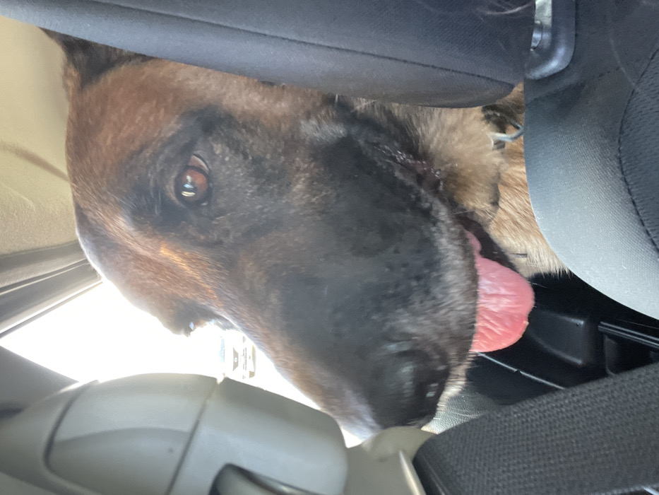 **Location:** Coatzacoalcos, Mexico. **Scene Description:** The image presents a close-up, angled view of a large, brindle-patterned dog, consistent with a German Shepherd breed, situated within the interior of a vehicle. The dog's head is the primary subject, occupying the central and right portions of the frame, oriented forward and slightly to the left. Its fur coloration consists of black, dark brown, and tan markings. The dog's right eye (viewer's left), brown in hue, exhibits a prominent light reflection. A black nose and an extended pink tongue are visible. A segment of a dark collar is discernible around the dog's neck. The vehicle's interior components partially frame the dog. On the left, a light-colored interior pillar or trim piece is present, alongside a vertical black seatbelt strap. A dark fabric car seat headrest is positioned on the right, partially obscuring the dog's profile. The background, visible through a vehicle window, displays an outdoor setting under bright daylight conditions. A light-colored, out-of-focus vehicle, likely a white SUV, is identifiable in the distant background. No human subjects are visible. The scene captures the dog observing the exterior environment from inside the vehicle.