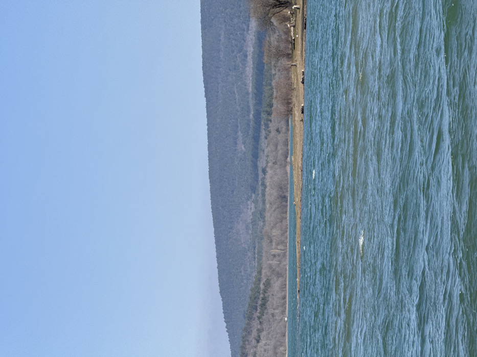 The image presents a wide exterior view of the Simferopol Reservoir in Simferopol, Ukraine, under a clear, light blue sky. The lower half of the frame is dominated by the reservoir's teal-blue water, exhibiting a choppy surface with numerous small waves and whitecaps, indicating surface agitation. A narrow, light brown shoreline spans the midground. Along this shore, sparse, bare deciduous trees and shrubs are visible. On the right section of the visible shoreline, several irregularly shaped, dark objects, possibly logs or large rocks, are scattered. A small, light-colored boat is partially visible on the water near the far left of the shoreline. The background consists of a range of hills covered in dense, dark green coniferous forest, forming a distinct, undulating horizon against the sky. A band of lighter-toned, bare deciduous trees is situated between the immediate shoreline and the coniferous hills. No individuals, animals, or specific actions are discernible within the frame.