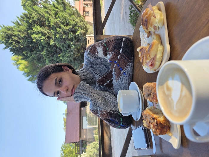 A young woman in a gray sweater sits at a table outdoors. She rests her chin on her hands, looking at the camera. The table holds a plate of ham and cheese croissants, two slices of coffee cake, and two cups of coffee. Trees and buildings are visible in the background. The image is slightly rotated counter-clockwise.
