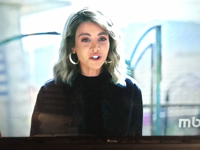 A photograph of a television screen displays a female subject in a mid-shot, depicting a scene located in the city of Ankpa, Nigeria. The woman, centrally framed, possesses wavy, shoulder-length hair of a light tone and wears prominent, light-colored hoop earrings. Her mouth is slightly ajar, indicating speech. She is dressed in a dark, long-sleeved garment. The background is brightly illuminated and out of focus, showing abstract structural elements in light blue and white hues. A "mbc" broadcast logo is visible in the lower right corner of the screen display. The bottom bezel of the physical television unit, marked with a "Sun King" brand, is partially visible at the base of the image.
