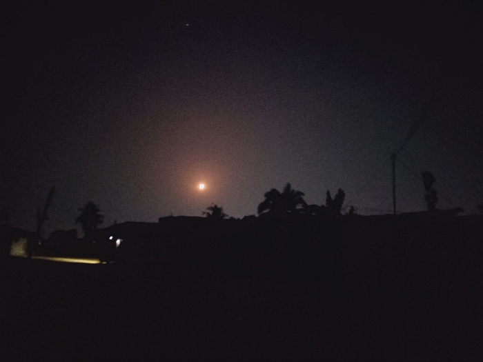 A very dark night scene shows silhouetted palm trees and rooftops against a dusky sky. A bright moon is the focal point, emitting a soft glow. A smaller, fainter light shines above and to the left of the moon. To the right, a tall pole or structure stands. The foreground is consumed by deep shadow, obscuring details of the landscape.