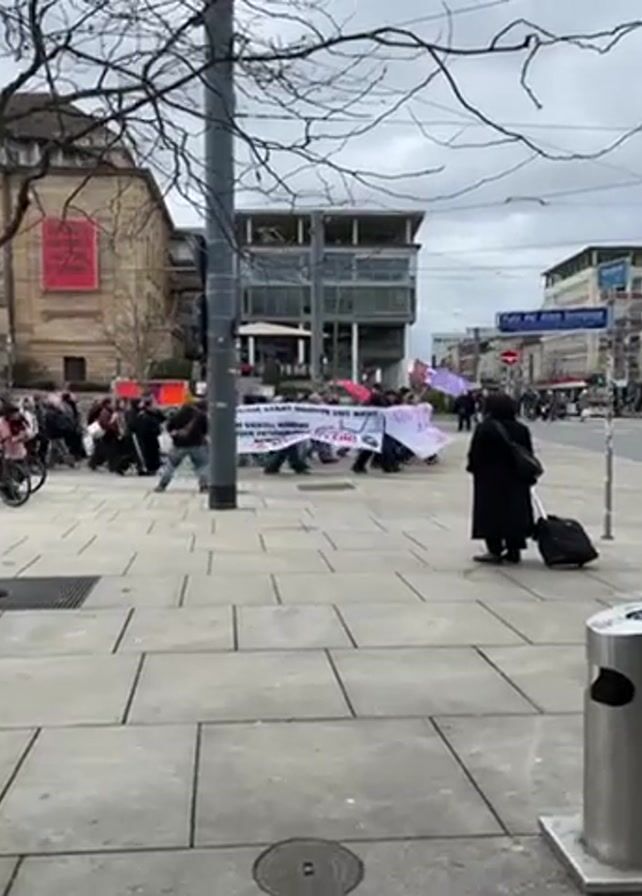 A demonstration or protest is in progress in a city plaza or public area with gray stone tile flooring. A crowd of people holding a large white banner with writing on it is walking through the space, and some people are carrying flags. Buildings surround the area, and a tree with bare branches stands nearby. Additional elements include a street light pole, metal trash can, bicycle, and luggage. The sky is overcast.