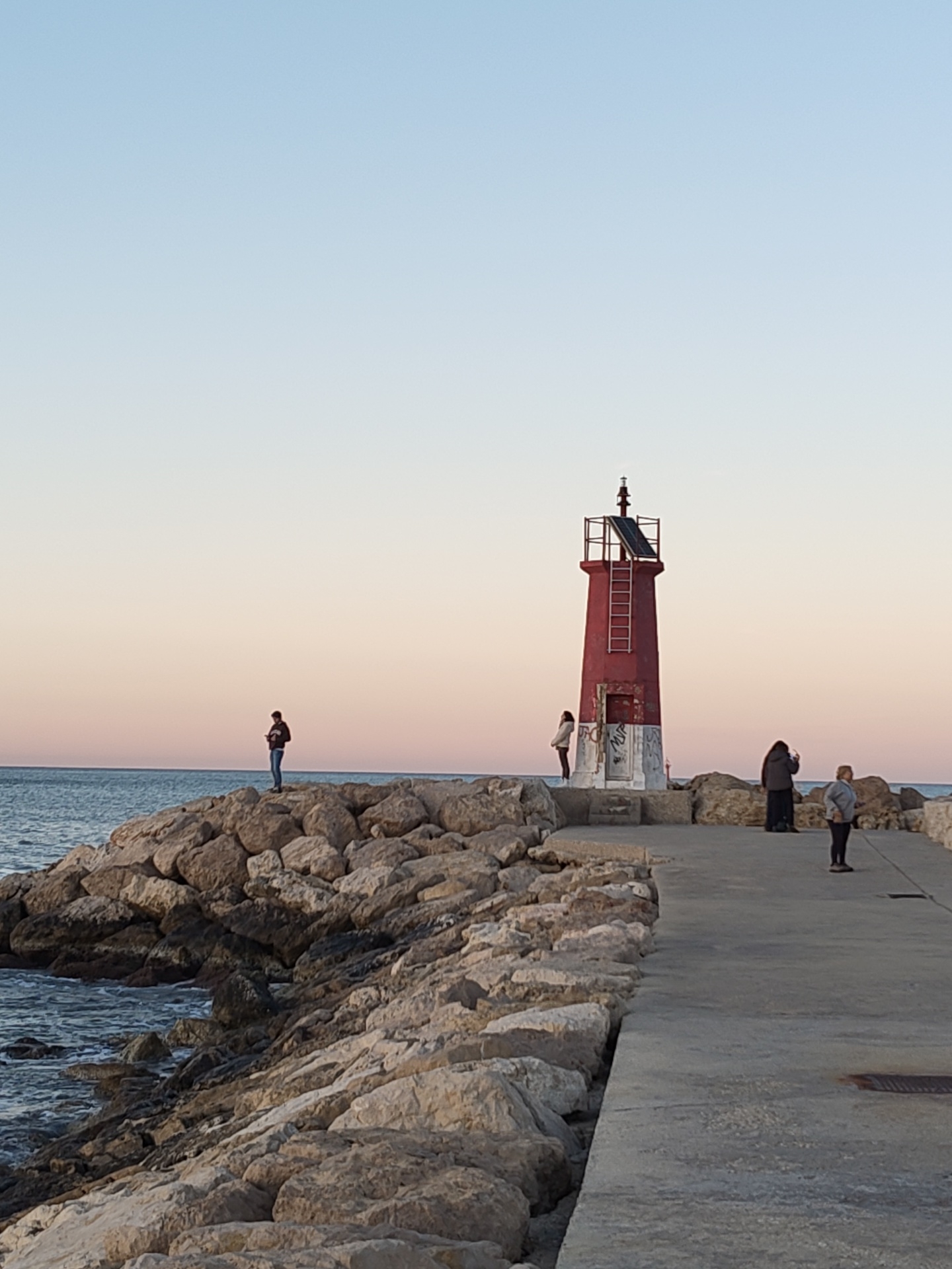 red and white lighthouse in Dénia, Spain, set against a pale gradient sky transitioning from pink at the horizon to light blue above. The lighthouse stands on a concrete pier bordered by large rocks. Five people are visible: one individual stands on the rocks near the water's edge, another stands beside the lighthouse, and three people are on the pier near the lighthouse. The water laps at the base of the rocks. The scene is lit by soft, natural light, indicating either sunrise or sunset.