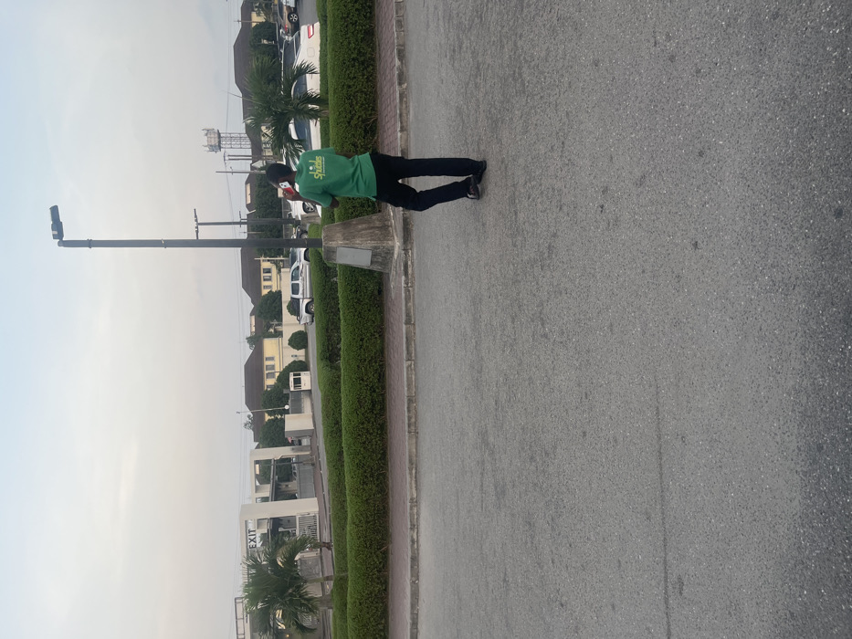 A person in a green shirt and dark pants is walking on a grey pavement next to a green hedge. Buildings and parked vehicles can be seen in the background under a light sky. A tall lamppost stands to the left. The image is oriented sideways, with the top of the image to the left. The scene appears to be an outdoor area near a residential or commercial zone.