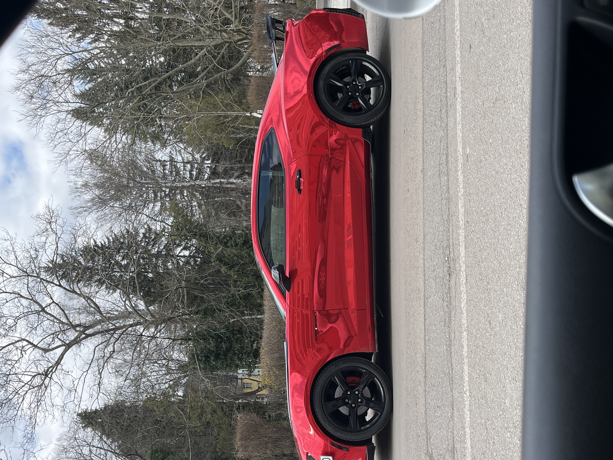 A glossy red Chevrolet Camaro, appearing to be a sixth-generation model with black multi-spoke wheels and red brake calipers, is centrally positioned on an asphalt road. The vehicle is captured in a side profile view, facing left, and features a black rear spoiler. In the background, a dense line of deciduous trees, predominantly bare of leaves, intermingles with several evergreen trees and shrubs. A light-colored building with yellow accents is partially visible behind the foliage in the mid-ground. The sky above is overcast with patches of visible blue. The immediate foreground shows the dark interior trim and a metallic door handle of the vehicle from which the photograph was taken. The scene is set in the city of Pernik, Bulgaria. No individuals are visible.