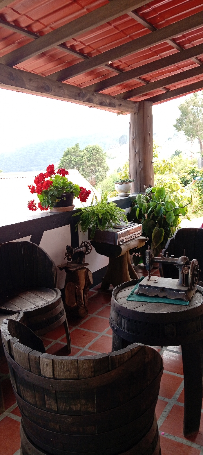 The image depicts a covered outdoor balcony or terrace in Colonia Tovar, Venezuela, furnished in a rustic style, overlooking a verdant mountain landscape. The overhead structure consists of a red corrugated metal roof supported by dark wooden beams and a large, unrefined wooden log acting as a column on the right. The floor is covered with reddish-brown square terracotta tiles. In the foreground and midground, several repurposed wooden objects are present. On the left, a dark wooden chair, constructed from a cut barrel, faces towards the right. Another similar barrel-chair is partially visible at the bottom of the frame. To the right of the leftmost chair, a small, gnarled wooden stand holds a miniature antique cast-iron sewing machine. Further right, a larger dark wooden barrel serves as a table, supporting a full-sized antique cast-iron sewing machine placed on a green textile mat. In the center-back, a rustic wooden table with an organic, tree-trunk-like base supports a vintage-style electronic receiver with multiple knobs and a potted fern plant. A sturdy white railing runs across the midground, separating the terrace from the view. On this railing, a dark pot filled with vibrant red geraniums is visible on the left, and a smaller white pot containing green succulents is further to the right. A large potted plant with broad green leaves is positioned on the floor to the right of the central wooden table. The background reveals a hazy, mountainous landscape covered extensively with green foliage and trees, indicative of a rural or semi-rural setting. A white roof structure of another building is partially visible below the railing on the left side of the frame. The sky above is bright and appears overcast or hazy. No people are present in the scene.