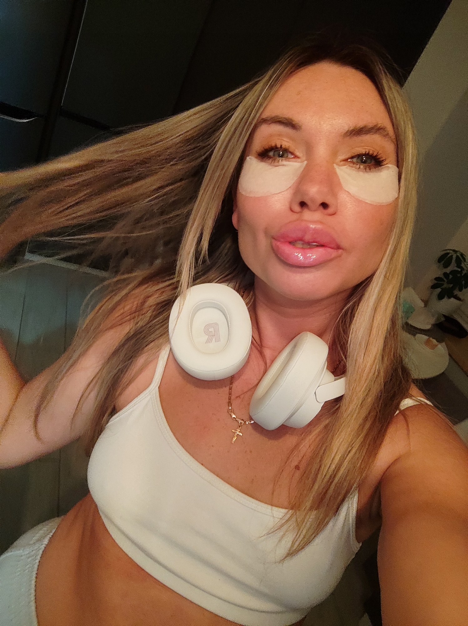 A fair-skinned woman with blonde hair is shown in a close-up selfie. She is wearing white under-eye patches, a white tank top, and white headphones around her neck. A gold chain with a cross pendant is visible on her neck. Her lips appear to be augmented. The background is partially visible, showing a dark wall and a blurred interior with a plant. There is no information in the image to determine a location in the city of Votkinsk, Russia.