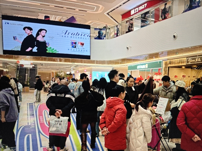 The image captures the interior of a brightly lit, multi-story shopping mall located in the Chongqing High-tech Zone, China. Approximately 30 to 40 individuals, predominantly adults, are visible on the ground floor, many dressed in winter outerwear such as puffer jackets and long coats. A large digital display screen dominates the upper central area, showcasing an advertisement for "luckin coffee" and "Arabica," featuring two models holding coffee cups. In the mid-right, a group of people congregates around a temporary retail setup consisting of clothing racks laden with garments and a white sign indicating a "SALE" with prices like "¥99.9" and "¥128/3." A woman in a red jacket and another in a white puffer jacket are observed browsing the merchandise, with a vendor assisting. In the immediate foreground, a person faces away from the camera, holding a white shopping bag with Chinese text. Escalators are visible on the left side of the background, ascending to upper levels. Storefronts with signage, including "UYTIGER" in green and "回力1927" (Huili 1927) in red, are present on both the ground and upper floors. The mall features high ceilings, white architectural elements, and large, colorful graphic decals on the floor.