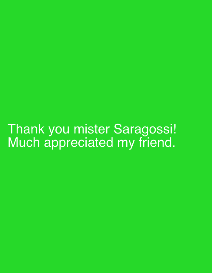 A simple, green-colored background displays the text, "Thank you mister Saragossi! Much appreciated my friend