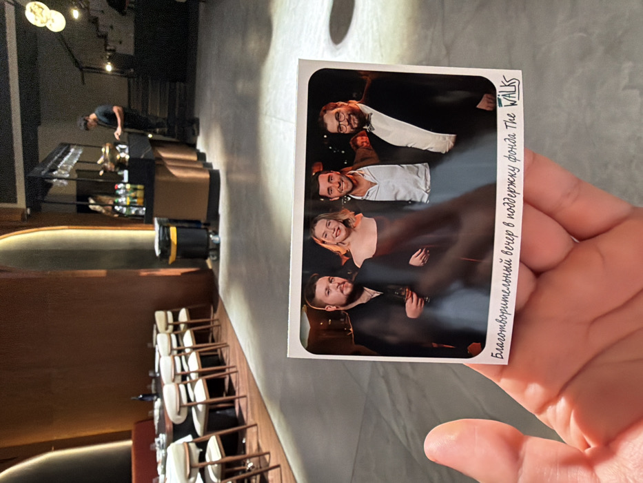 A hand holds a glossy print photo featuring four people dressed for an event. Above the group, "The Walks" is printed. Along the side is Russian text reading "Благотворительный вечер в поддержку фонда". The background shows a modern interior with a bar, stools, and a person tending to it. The photo’s subject implies a charity event featuring a musical group.