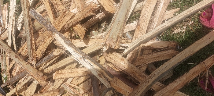 The scene in Mosop ward, Kenya, depicts a substantial, irregularly stacked pile of light brown wood pieces. These pieces vary in length and thickness, exhibiting splintered and fibrous textures, consistent with firewood or processed plant material. They are haphazardly arranged over a surface of green grass and some visible soil. Direct sunlight illuminates the scene, casting subtle shadows among the wood fragments. In the lower left and right portions of the frame, fragments of pink/red footwear are visible, suggesting the close proximity of an individual to the pile. No other individuals or specific actions are discernible.