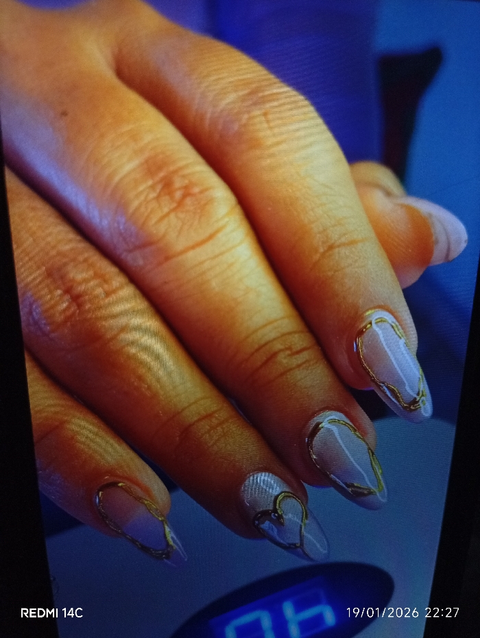 A hand displays long, almond-shaped nails with a pale, semi-transparent base. Each nail is adorned with a gold outline. One nail showcases a heart-shaped gold design. The hand, illuminated with a warm light, rests on a blue surface. A digital display with "REDMI 14C" and "19/01/2026 22:27" is visible on the bottom of the image.