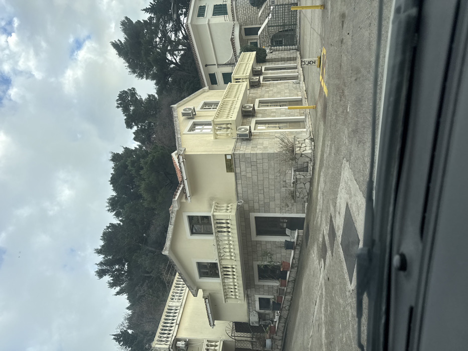 The image depicts an outdoor static scene in Petrovac Centar, Montenegro, captured from the interior of a vehicle, evidenced by a dashboard and windshield wiper partially obscuring the lower foreground. The dominant subject is a two-story building complex with a light yellow stucco upper facade and a lower section constructed from light grey stone blocks. The buildings feature red-tiled gable roofs, white balustrade balconies on the second level, and multiple rectangular windows and doors with dark frames. Several external air conditioning units are mounted on the exterior walls. Planters containing sparse vegetation are positioned along the ground-level facade. The immediate foreground consists of a paved surface, likely concrete or asphalt, showing signs of wear and repair. On the right side of the paved area, several yellow vertical bollards are visible, along with yellow ground markings and a black sign bearing the text "ZON" and an arrow pointing right. In the background, a dense evergreen forest covers a steep hillside, rising above and behind the buildings. Portions of other similar architectural structures are visible on both the left and right sides of the main building complex, with a metal gate discernible on the right. The sky overhead is overcast with visible cloud formations. No individuals are present in the depicted scene.