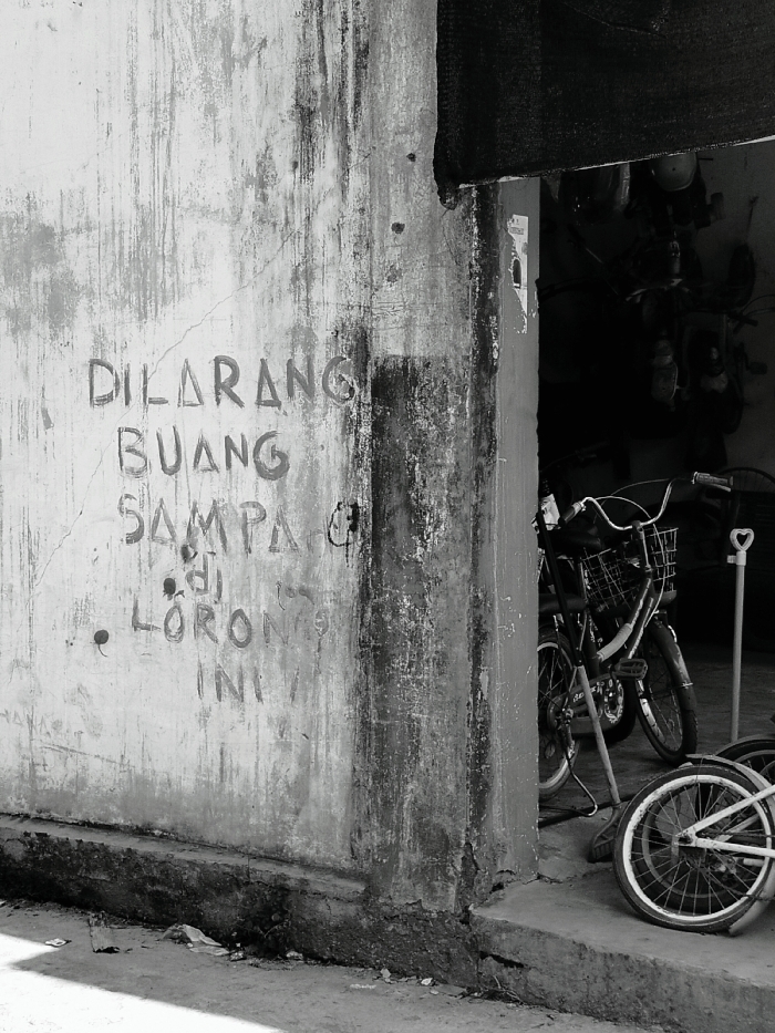 A black and white photograph shows a weathered wall with Indonesian script reading "DILARANG BUANG SAMPAH DI LORONG INI" (No Dumping Garbage in This Alley)