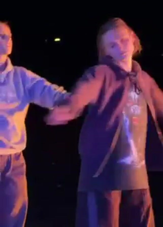 Two people embrace in a dimly lit, stage-like environment. The individual on the right is wearing a maroon tracksuit, while the person on the left is in a blue hoodie and gray sweatpants. They face each other and wrap their arms around one another in a heartfelt hug. The background is dark, emphasizing the two figures in the foreground. The lighting seems to be coming from below, casting a soft glow on them.