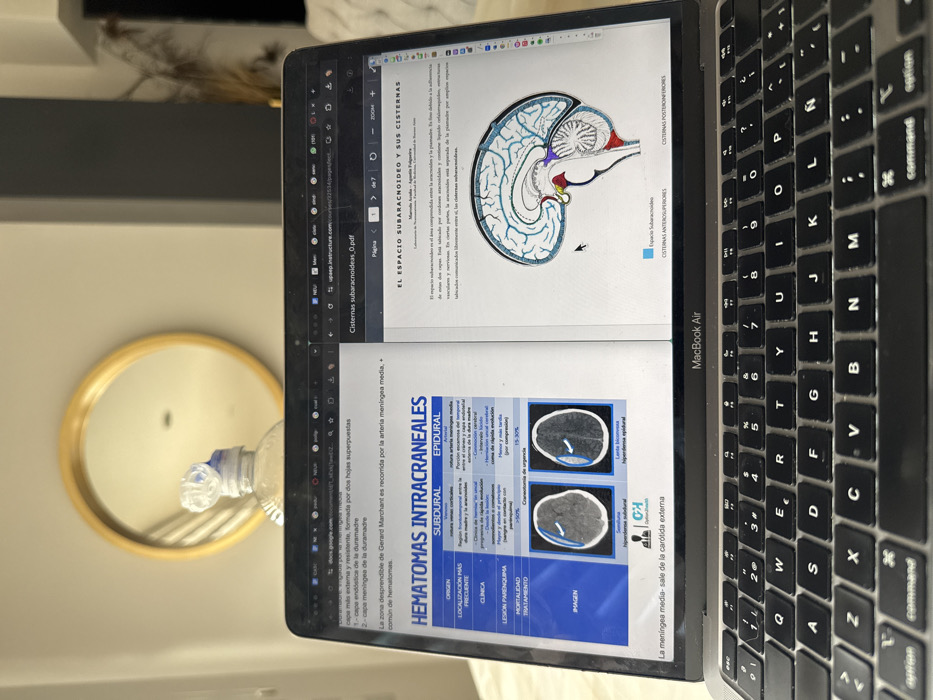 A silver MacBook Air laptop is prominently positioned in an indoor setting in Santa Clara Ocoyucan, Mexico. The laptop screen displays two open PDF documents side-by-side. The left document, titled "HEMATOMAS INTRACRANEALES," details intracranial hematomas, comparing subdural and epidural types through text, a table, and two illustrative CT scans of the brain. The right document, titled "EL ESPACIO SUBARACNOIDEO Y SUS CISTERNAS," presents information about the subarachnoid space and its cisterns, featuring a colorful sagittal diagram of the human brain. A mouse cursor, shaped as an arrow, is visible on the right document. Behind the laptop, a translucent plastic bottle with a blue cap is situated. Further back, a circular mirror with a golden frame is mounted on a light-colored wall, reflecting a bright light source. To the right of the mirror, a dark gray wall or furniture piece is visible, with partial dried plant decor. No individuals are present in the image.