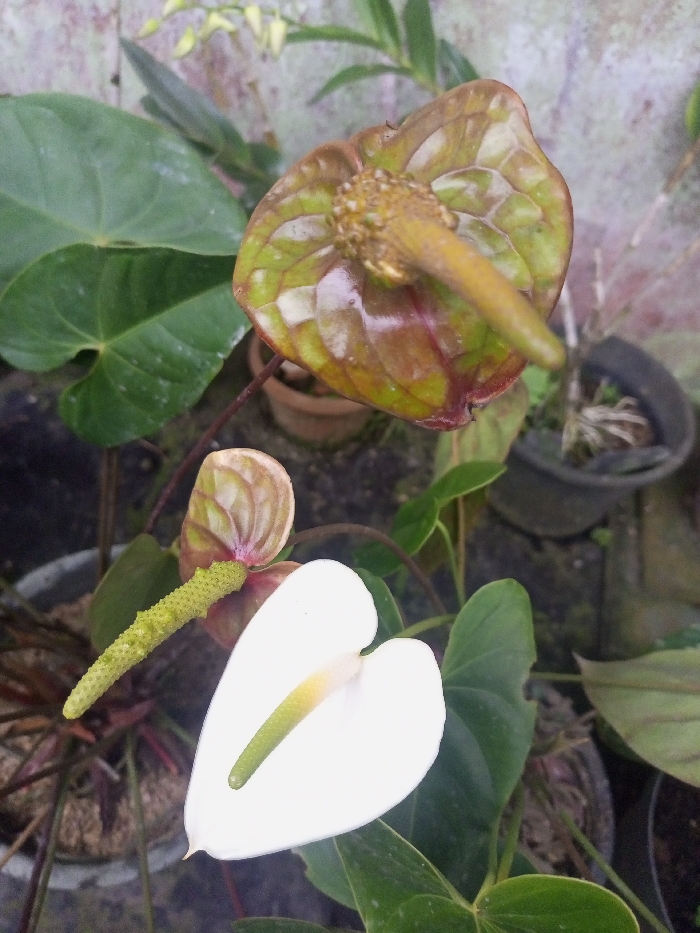 The scene, located in Bamhori, India, presents a close-up view of Anthurium plants. In the lower foreground, a white Anthurium bloom is visible, characterized by a heart-shaped spathe and a prominent light green spadix. Positioned above and slightly behind this, another Anthurium bloom appears from the reverse perspective, featuring a spathe mottled with green, brown, and reddish tones, and a thick, brownish-yellow spadix. A third Anthurium spathe, light pinkish-brown with a green, textured spadix, is partially visible to the left. Dark green, cordate leaves typical of Anthurium plants are distributed throughout the frame. The background includes several dark-colored plant pots containing soil, indistinct green foliage, and sparse light-colored flowers. A light, weathered wall surface is visible behind the plants. No individuals are present, and no specific actions or interactions are occurring.