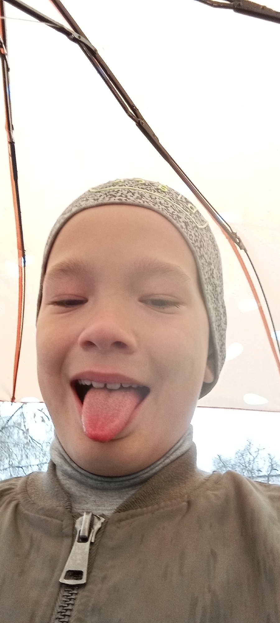 A young boy wearing a grey beanie, a grey turtleneck, and a brown jacket with a prominent zipper is sticking his tongue out. He appears to be taking a selfie under an umbrella, possibly outdoors in the city of Dmitrov, Russia, as suggested by the bare branches of trees visible in the background.
