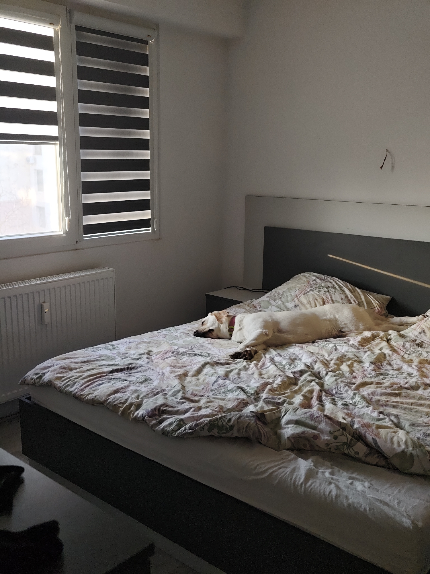 A white dog with a pink collar sleeps on a bed with a floral comforter in a bedroom. A window with black and white blinds is visible to the left of the bed, next to a white radiator. A gray headboard is behind the bed. A small black table is next to the bed. A dark table is visible in the lower left corner. It is daytime, and the room is lit by natural light. The location is likely an apartment or house, but the specific location in Kozloduy, Bulgaria is not discernible from the image.