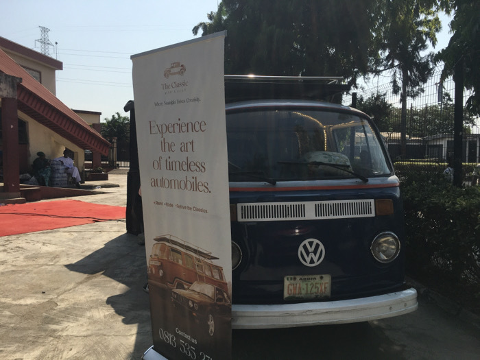 A dark blue Volkswagen Type 2 van, featuring a red/orange stripe below the windshield and a roof rack, is parked outdoors on a concrete surface in Lagos, Nigeria