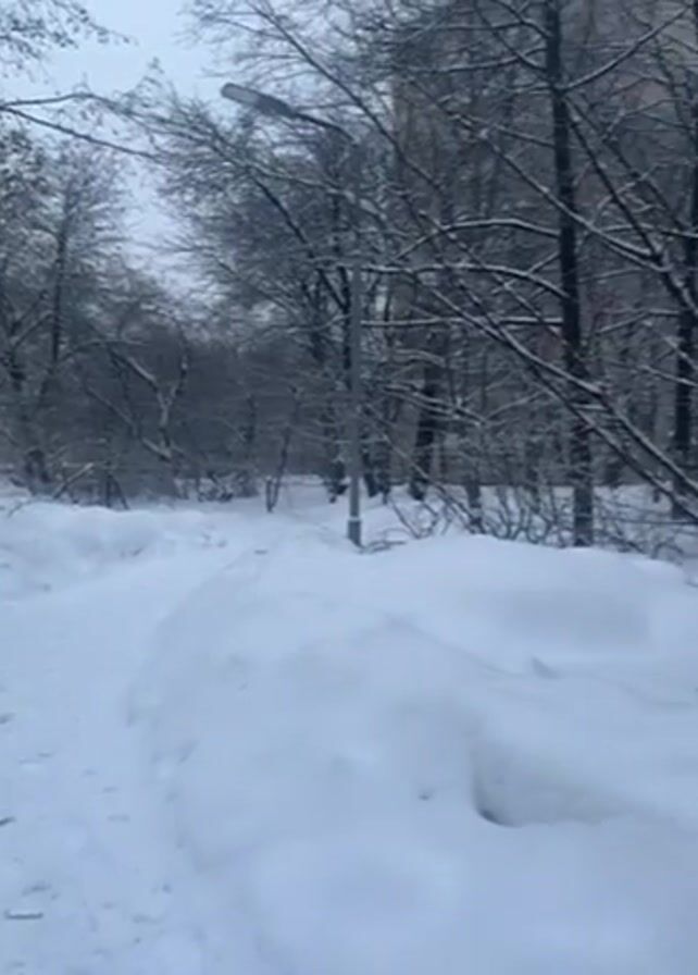 The video presents a serene view of a snow-covered path in what appears to be a park or residential area. Snow covers the ground and lines the path in thick mounds. Bare trees, dusted with snow, stand on either side of the path. In the background, a building can be seen through the trees. A lamppost is visible along the path. The scene is quiet and still, with a heavy blanket of snow suggesting a recent or ongoing snowfall.