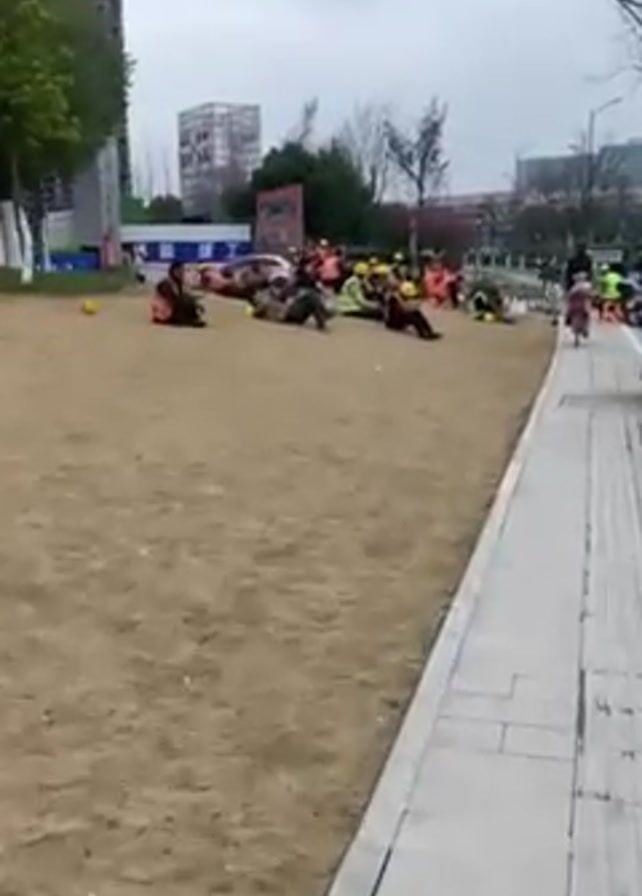 group of people, many wearing yellow hard hats and some wearing orange safety vests, sitting and lying on a dirt or sand covered area next to a sidewalk. Some appear to be looking at their phones. A child on a bicycle rides past on the sidewalk, followed by a parked scooter or small motorcycle. Buildings are visible in the background, including a tall building under construction. The sky is overcast.