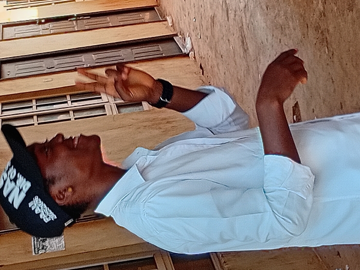A person in a white shirt and black baseball cap with white lettering looks upwards with a smile. The cap reads "RAW ON NAS". They are making a peace sign with their right hand. A watch is visible on their left wrist. They appear to be standing outdoors. Behind them is a building with multiple windows and doors. The building's color palette is primarily earth tones.