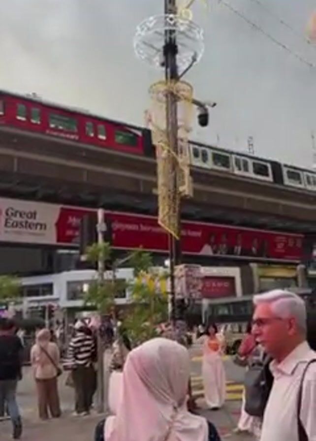 The video captures a street scene in what appears to be a bustling urban area. Several people are walking along the sidewalk. An elevated train on a track passes overhead. A large advertisement featuring the "Great Eastern" logo is visible on the side of the train track structure. Decorative street lights adorn the scene. The camera angle is at ground level and moving slightly, presumably held by someone walking. The atmosphere seems lively.