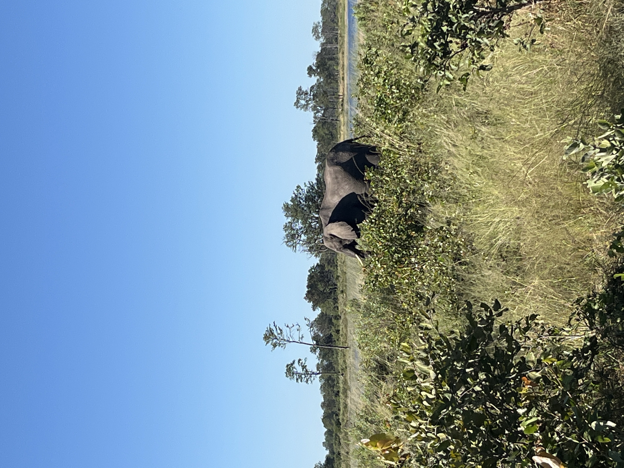 n elephant in the Khwai region of Botswana. The elephant is partially obscured by vegetation, including tall grass and bushes. A line of trees is visible in the background, likely along a waterway. The sky is clear and blue. The scene appears to be a natural environment within the Khwai region.