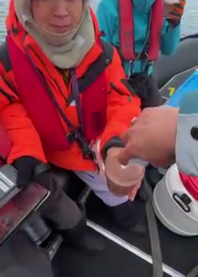 The scene unfolds on a gray inflatable boat, likely in a cold, possibly icy environment
